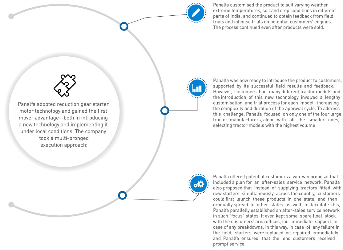 Panalfa adopted reduction gear starter motor technology and gained the first mover advantage—both in introducing a new technology and implementing it under local conditions. The company took a multi-pronged execution approach: